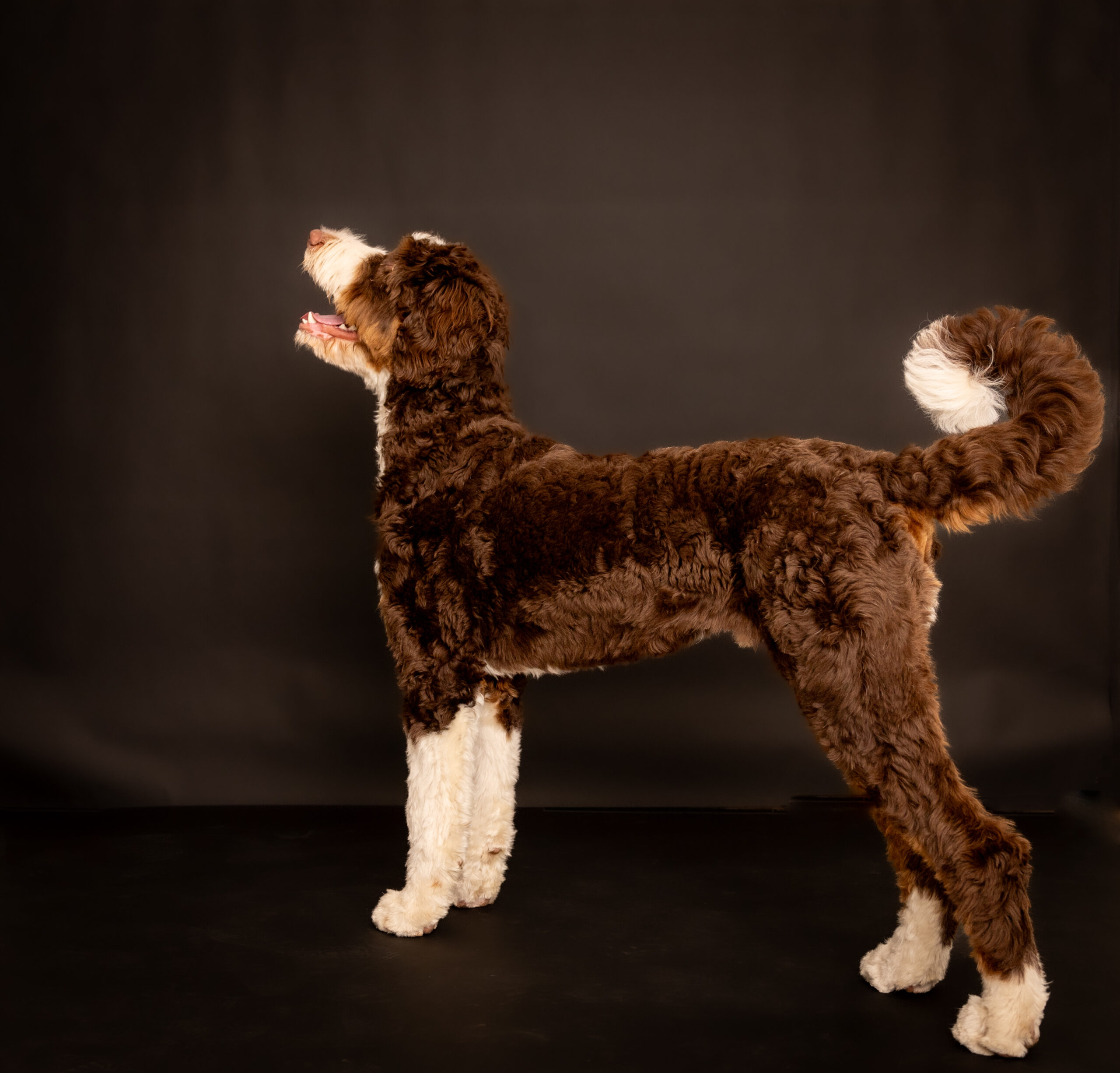 Handsome on every angle. Elliot has a remarkable wavy coat, liver nose, and stunning green eyes. He is human focused, treat motivated, and ready to please. Now ready to produce stunning pups.
